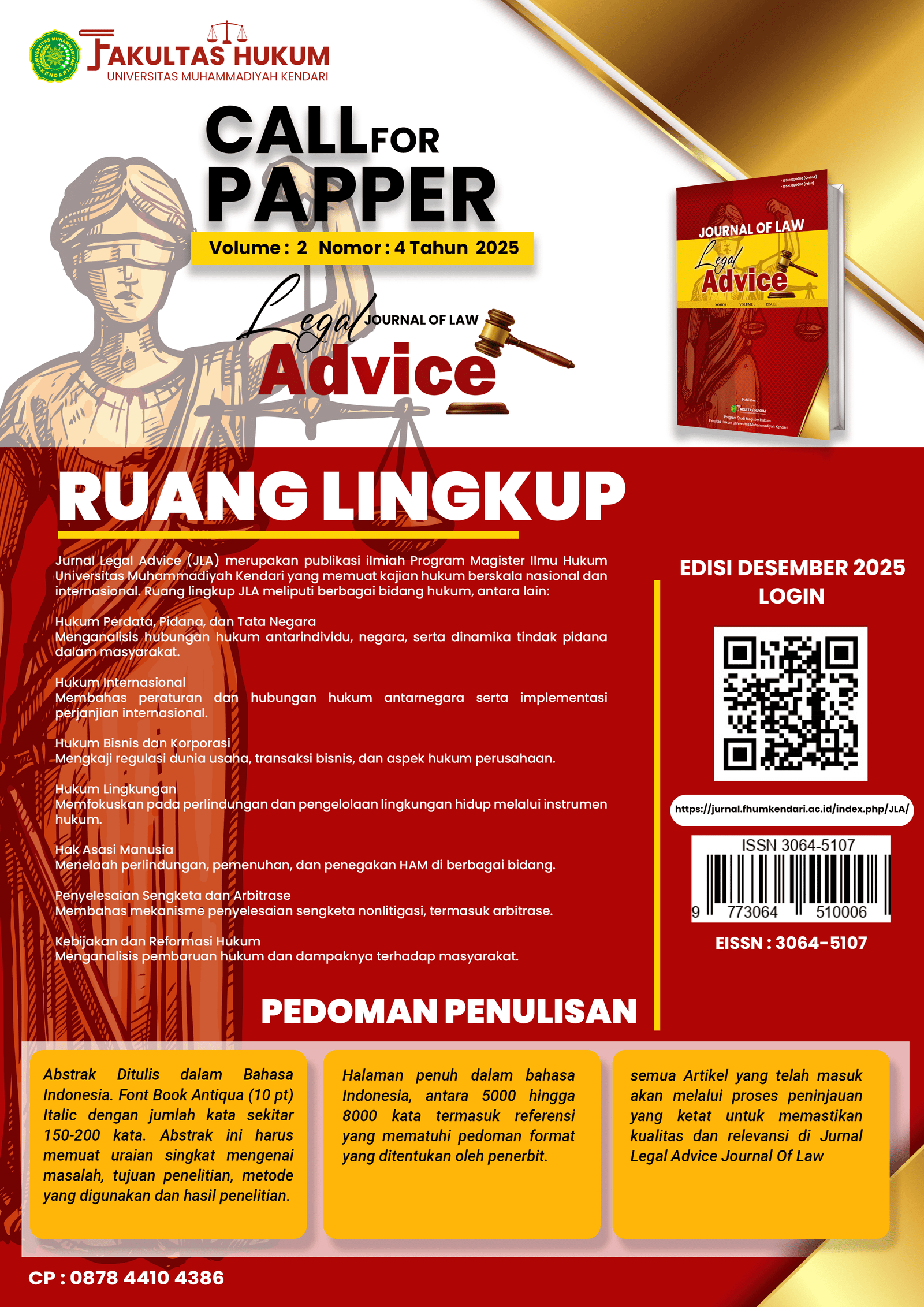 Info Penting : Disampaikan kepada Autor/Penulis jika mengalami masalah saat Upload Artikel agar melaporkan kepada kami (Admin), karena kami menggunakan Screaning File Pencegah File terinfeksi Malware masuk kedalam jurnal Legal Advice, dan mohon mencantumkan Kontak Person/WA yang dapat dihubungi pada Pesan/Massage saat Submit Artikel. Terimakasih